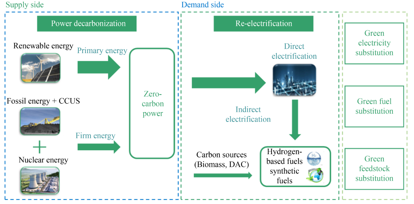 在能源的消费侧,要重塑能源利用底层逻辑,即基于零碳电力的“再电气化”。 “再电气化”包含双重内涵:其一是直接电气化,即能电气化尽电气化,以电代煤、以电代油、以电代气,在工业领域,采用电力驱动的设备来替代传统化石燃料驱动的设备,如用电锅炉、电窑炉替代煤锅炉、煤窑炉;在钢铁生产中,采用电弧炉炼钢取代传统的高炉炼铁和转炉炼钢工艺;在交通领域,电动汽车是一种典型的以电代油的交通工具;在建筑领域,采用电供暖、电热水器替代传统的依赖煤或天然气的建筑供暖和热水供应,由此实现各行各业的脱碳和走向零碳。