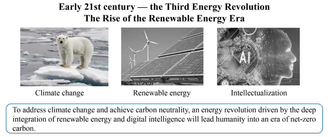 当今,我们正站在第三次能源革命的起点上,与前两次不同,这次革命的核心驱动力来自地球气候变化和全球碳中和共识,特征是可再生能源与数字智能的深度融合,是从化石能源走向新能源的革命,将摆脱对碳基能源(煤、油、气)的依赖,转向以非碳基能源为主导。能源开发利用的逻辑发生了根本性转变,过去的能源开发主要依赖煤、石油、天然气等埋在地下的资源禀赋,将转向基于科技创新的新能源开发利用,通过科技进步,把风和光等新能源转化为人类可以方便利用的稳定电力,能源开发利用将从资源属性走向科创属性。我们可以看到,每一次能源革命都不仅仅是能源品种的简单替代,更是整个能源技术和体系的根本性重构。