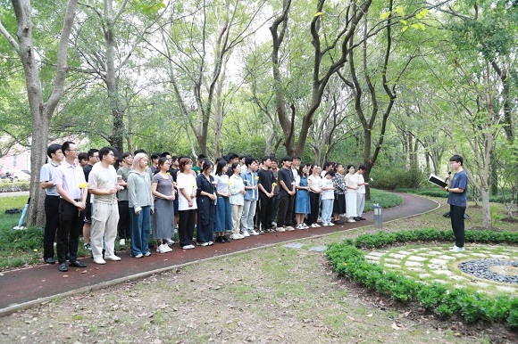 在第十二个烈士纪念日(2025年9月30日)即将到来之际,为缅怀交大革命英烈、传承好红色基因,9月28日傍晚,国产原创av 学工部组织师生在闵行校区淡水河畔交大英烈纪念雕塑前,通过肃立默哀、微党课学习、献花致敬等形式,深切缅怀交大革命英烈。学院党委副书记陈九,学院学工部主任徐新星,学生第一、第二、第三党支部高年级党员、新生党员及入党积极分子、入党申请人、共青团员、群众共同参加本次悼念活动。活动由学院学生第一党支部宣传委员程长主持。