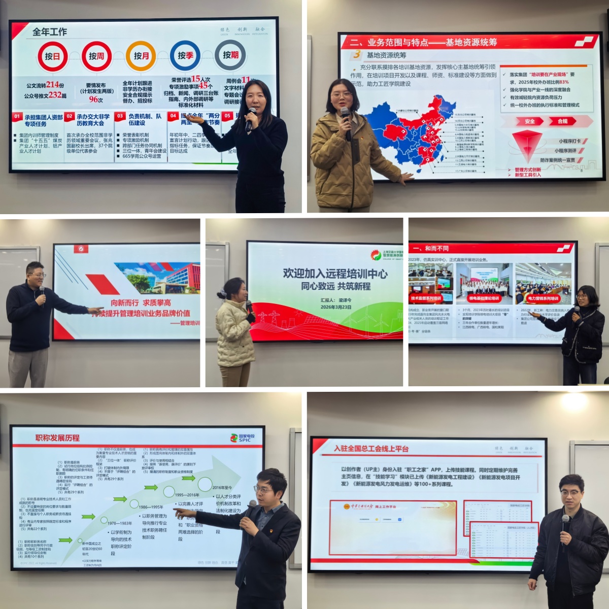随后,培训学院六个中心业务骨干分别作部门业务介绍。骨干们围绕部门职责、业务板块、重点项目、团队建设、工作心得等展开交流,有业务全景呈现、有团队整体风貌;有重点业务主要流程,有难点任务突破方法;有上年度工作和业绩,有今年工作措施计划。业务分享为新员工短时间内快速掌握培训学院业务框架、转变角色身份、建构岗位工作内容提供高效渠道。新员工围绕介绍所学,结合入职后工作,简要分享体会收获。